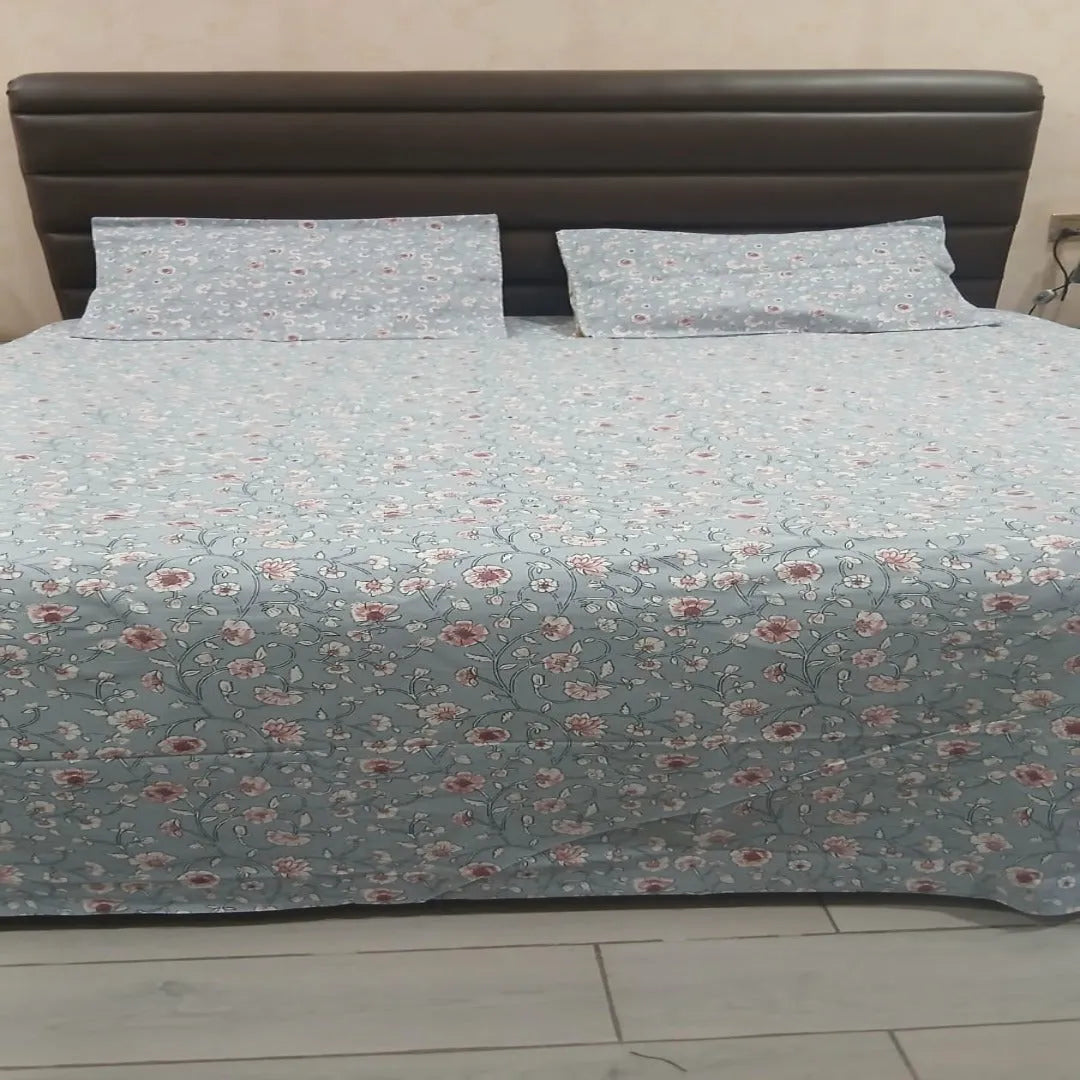 Create a calm and refreshing bedroom atmosphere with this pastel floral printed cotton bedsheet set, featuring soft blue tones and delicate floral motifs. The subtle pattern adds elegance while maintaining a light and soothing look, ideal for everyday comfort.